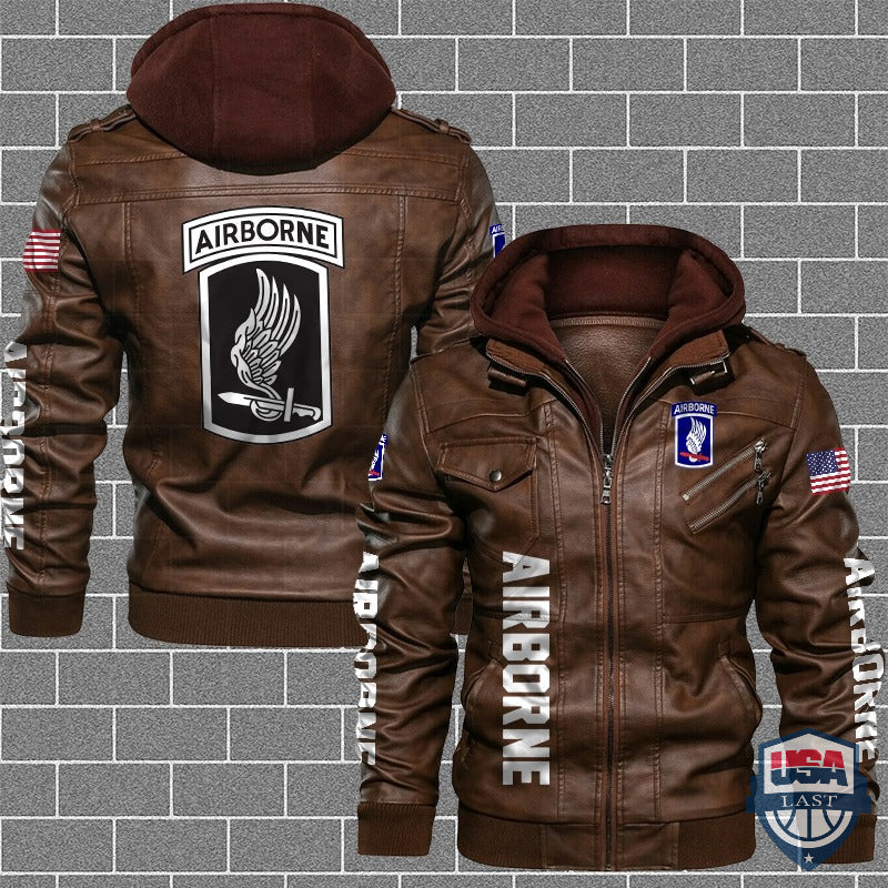 Add an element of ruggedness to your look with this lumbersnack-worthy bomber jacket. It has lots of internal and external pockets for keeping your belongings safe and hands warm. There is also a zip-off hood so you can wear it up or take it off for a dressier look. The exterior is eco-friendly faux leather, while the lining is polyester with cotton stuffing to keep you toasty. 173rd Airborne Brigade Leather Jacket. Plus, the central zip closure and ribbed waistband and cuff will keep any frosty wind or snow out. Best of all, it comes in an extended size range from extra-small to six-X tall, so no matter your build, you can rock this leather jacket.