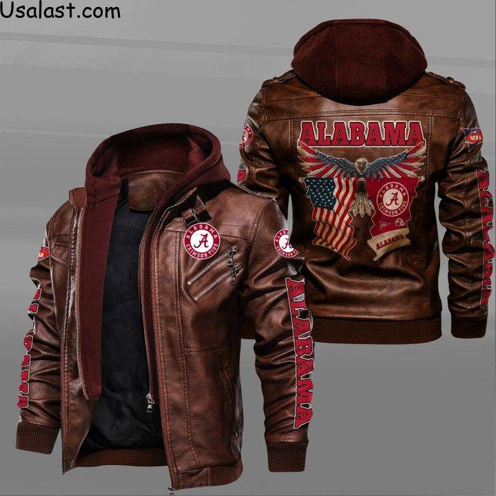 ” alt=”Alabama Crimson Tide Bald Eagle American Flag Leather Jacket” />Add an element of ruggedness to your look with this lumbersnack-worthy bomber jacket. It has lots of internal and external pockets for keeping your belongings safe and hands warm. There is also a zip-off hood so you can wear it up or take it off for a dressier look. The exterior is eco-friendly faux leather, while the lining is polyester with cotton stuffing to keep you toasty. Plus, the central zip closure and ribbed waistband and cuff will keep any frosty wind or snow out. Best of all, it comes in an extended size range from extra-small to six-X tall, so no matter your build, you can rock this leather jacket.
