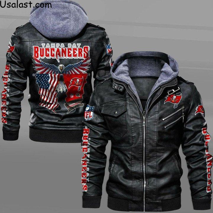 ” alt=”Tampa Bay Buccaneers Bald Eagle American Flag Leather Jacket” />Add an element of ruggedness to your look with this lumbersnack-worthy bomber jacket. It has lots of internal and external pockets for keeping your belongings safe and hands warm. There is also a zip-off hood so you can wear it up or take it off for a dressier look. The exterior is eco-friendly faux leather, while the lining is polyester with cotton stuffing to keep you toasty. Plus, the central zip closure and ribbed waistband and cuff will keep any frosty wind or snow out. Best of all, it comes in an extended size range from extra-small to six-X tall, so no matter your build, you can rock this leather jacket.